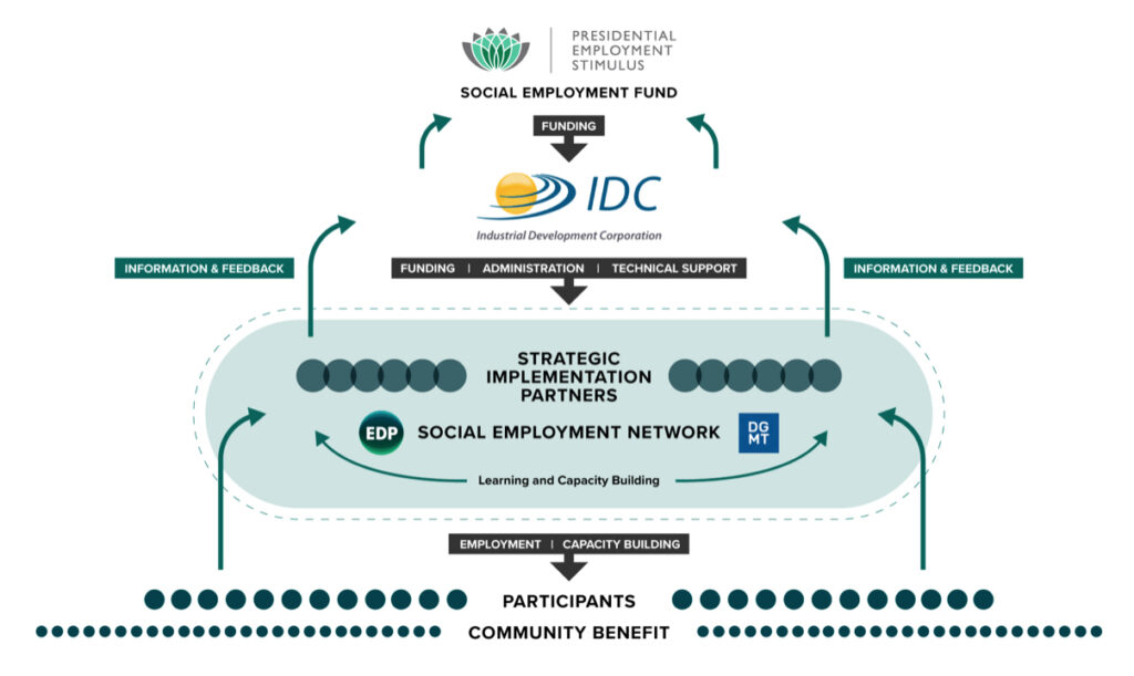 The SIPs in turn partner with a minimum of 1 000 CBOs and grassroots structures that run work programmes for the common good. Through the SIPs the SEF provides temporary work for unemployed people, who learn valuable skills and earn a stipend. In real terms, this translates to supporting 50 000 individuals on a monthly basis.